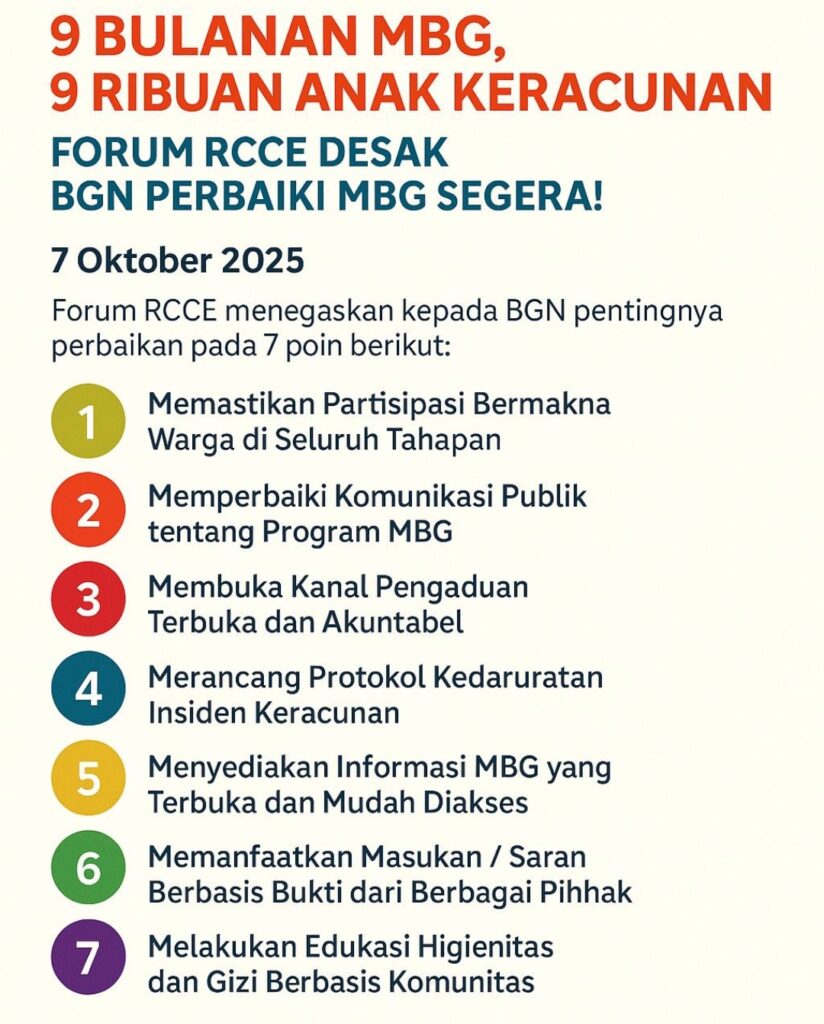 Forum RCCE (Risk Communication and Community Engagement) sepakat dengan semua poin rekomendasi yang disampaikan Pokja MBG – CISDI, GKIA, dan JPPI saat audiensi dengan Komisi IX DPR tersebut diatas yang meliputi evaluasi, perbaikan tata kelola, rancang ulang program, partisipasi warga, keamanan pangan, pemenuhan gizi sesuai pedoman Kemenkes dan pembatasan ultra-processed food serta makanan tinggi gula, garam, lemak (GGL) pada MBG.